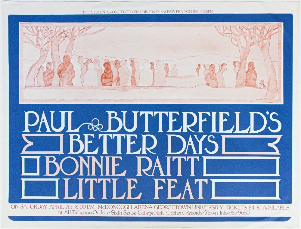 This RARE poster announced Paul Butterfield's Better Days, Bonnie Raitt, and Little Feat playing at the McDonough Arena at Georgetown University on April 7th, 1973. Paul Butterfield's Better Days was a short-lived band that formed in the wake of the Butterfield Blues Band's breakup in 1971. Little Feat was at the height of their creativity with frontman/founder Lowell George just after they released the classic recording “Dixie Chicken”. Bonnie Raitt is widely considered to be one of the greatest singers and songwriters of all time and has been performing for over 50 years. This was a stacked lineup, and was the FIRST time Little Feat and Bonnie Raitt shared a stage!
