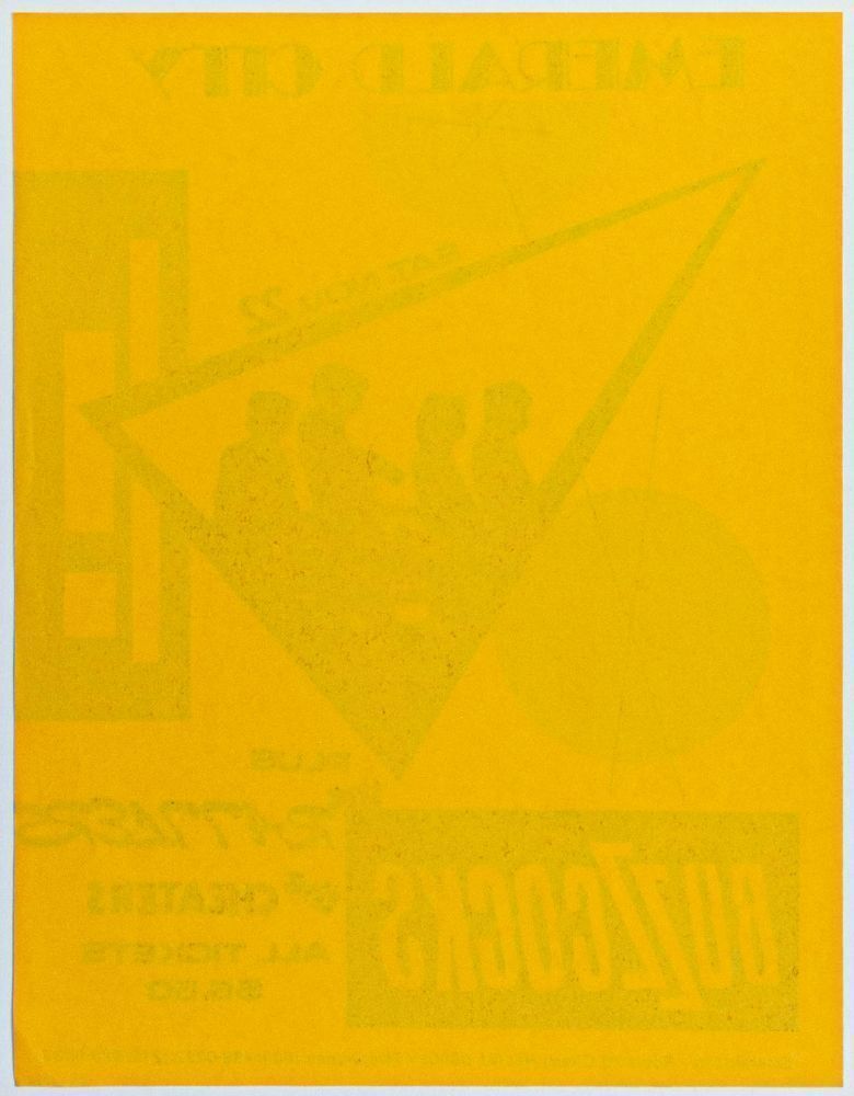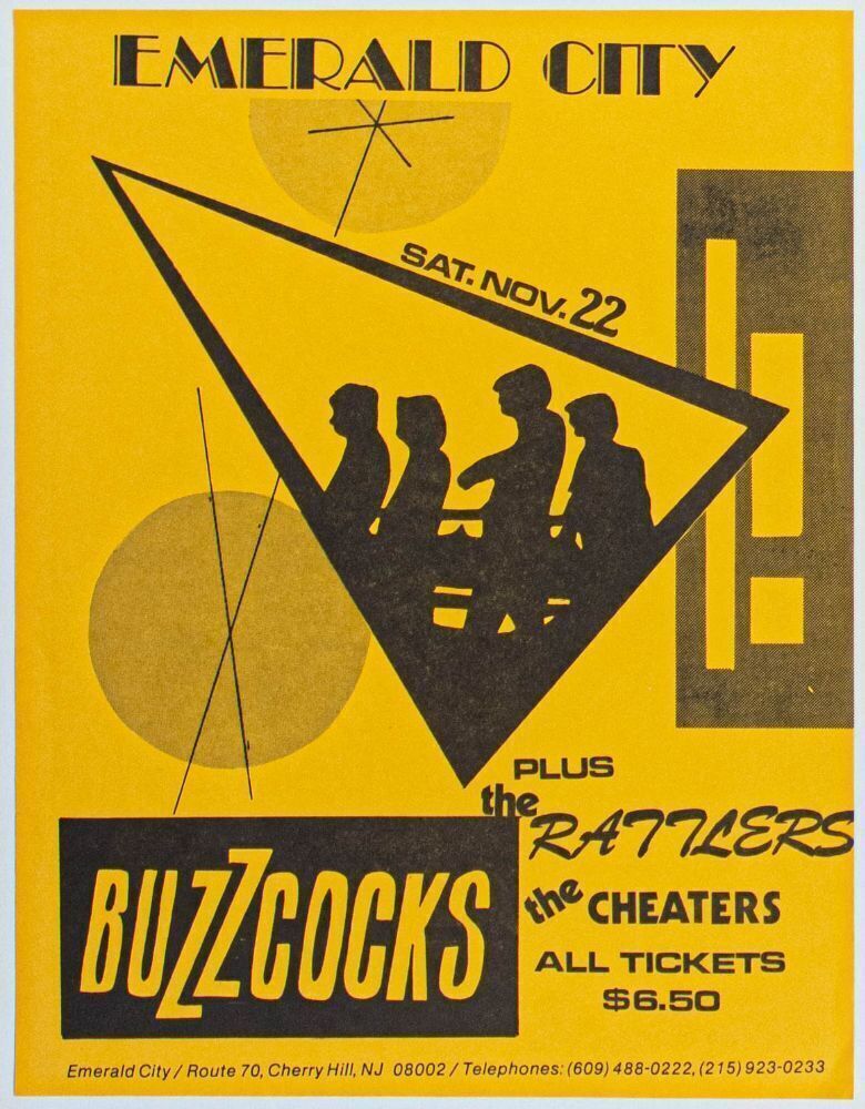 This poster was designed for The Buzzcocks' November 1980 appearance at Emerald City in Cherry Hill, New Jersey. The legendary British punk/powerpop band, formed in 1976, is often considered to be one of the progenitors of the pop-punk genre. They would break up the following year before reforming in 1989. Though lead singer Pete Shelley died in 2018, the band continues to perform today.