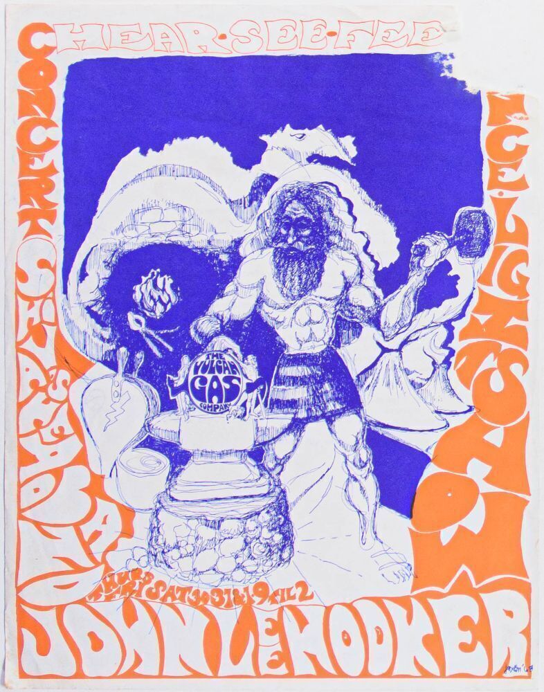 Jack Jaxon designed this rare, original handbill for the Vulcan Gas Company appearances of blues icon John Lee Hooker and Shiva's Headband in early 1969. This is the only handbill Jaxon designed for the Vulcan Gas Company in the entire series. Jaxon also created FD-114, The Fugs Avalon poster; he had already become a noteworthy cartoonist by being a co-founder of the famous Rip Off Press. Many consider him to be one of the very first underground comix artists. Material for the Vulcan Gas Company in Austin, Texas, is some of the most desirable and valuable in the entire genre of Psychedelic Concert art. Very few of these unique and fragile handbills remain available today in ANY condition.