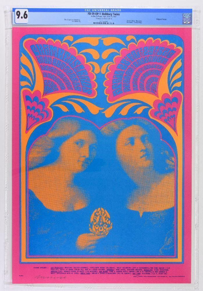 This fabulous image by Victor Moscoso utilized stunning composition and color. The poster borrows a Renaissance-style painting of two women in bright day-glow colors. The massive eye appeal reminds us of the Neon Rose poster series.
