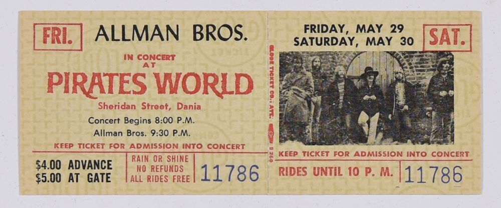 Here we have a 100% original and authentic, unused ticket for the Allman Brothers Band (with Duane) at Pirate's World in 1970. Our records show that these shows scheduled for May 29th and 30th in Dania, Florida, were canceled, and the band performed on the 31st at City College in New York.