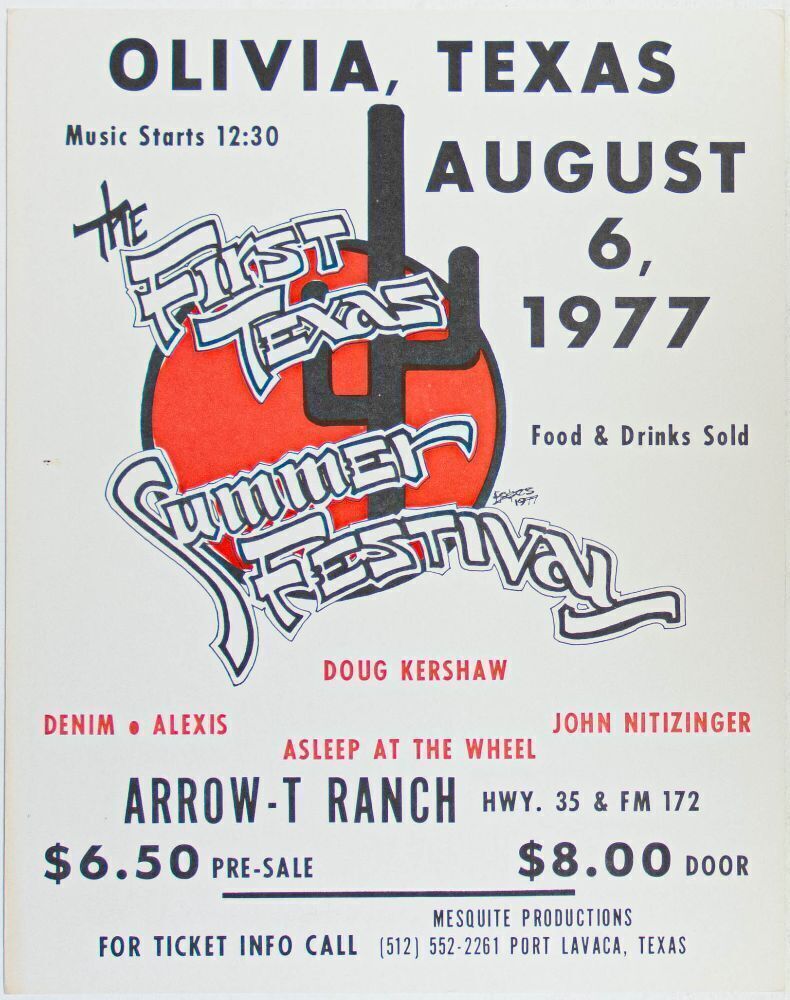 This rare original Texas poster advertises Doug Kershaw, Asleep at the Wheel and more appearing at The First Texas Summer Festival held at Arrow-T Ranch in Olivia, Texas.