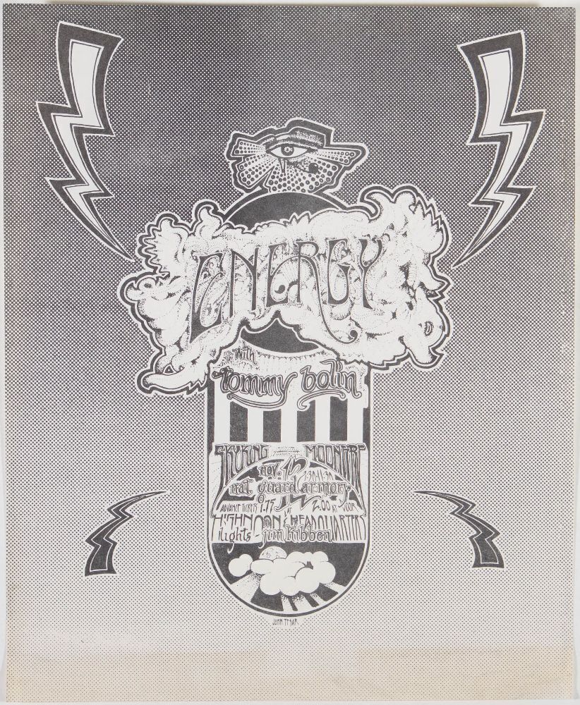 This vintage psychedelic flyer advertised a concert for the band Energy featuring Tommy Bolin, which took place on November 12 at the National Guard Armory.