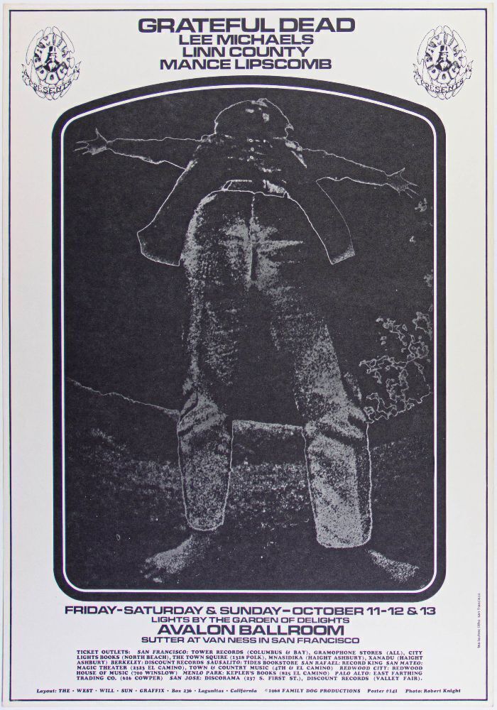 This later edition original Avalon poster featured the Grateful Dead for a three-night run in October of 1968. This Wes Wilson black and white image is from the later days of Family Dog at the Avalon. The budget was small for producing posters by this point in the series and the promoter was only able to produce black and white images.