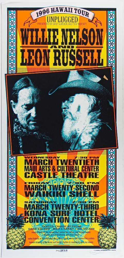 This poster promotes the Willie Nelson Leon Russell Hawaii Tour for a run of shows in 1996. It was created by poster artist Mark Arminski.