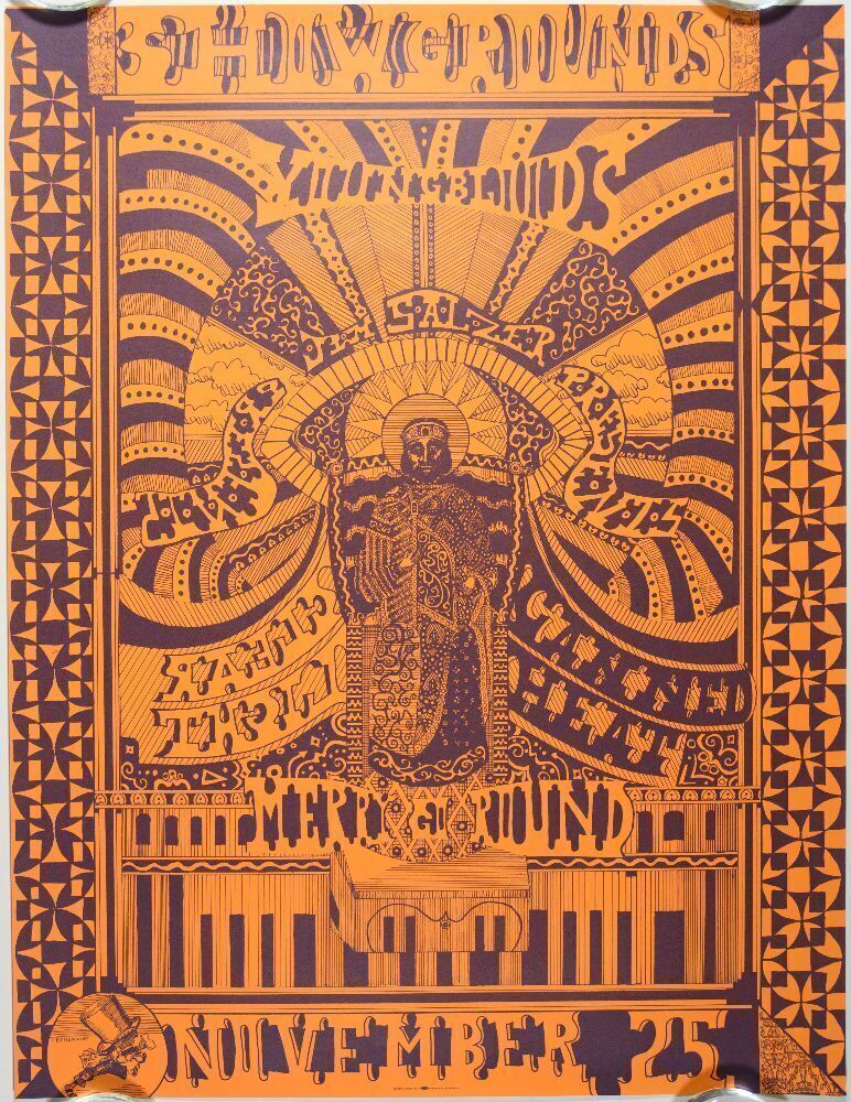 Original printing poster advertising Youngbloods with Canned Heat, Clear Light, and Merry-Go-Round, appearing at Earl Warren in Santa Barbara, California on November 25th, 1967. Incredible artwork by the great Frank Bettencourt. The show was promoted by the showgrounds' Jim Salzer. This poster includes the Maron Litho union logo printer's bug on the bottom edge.