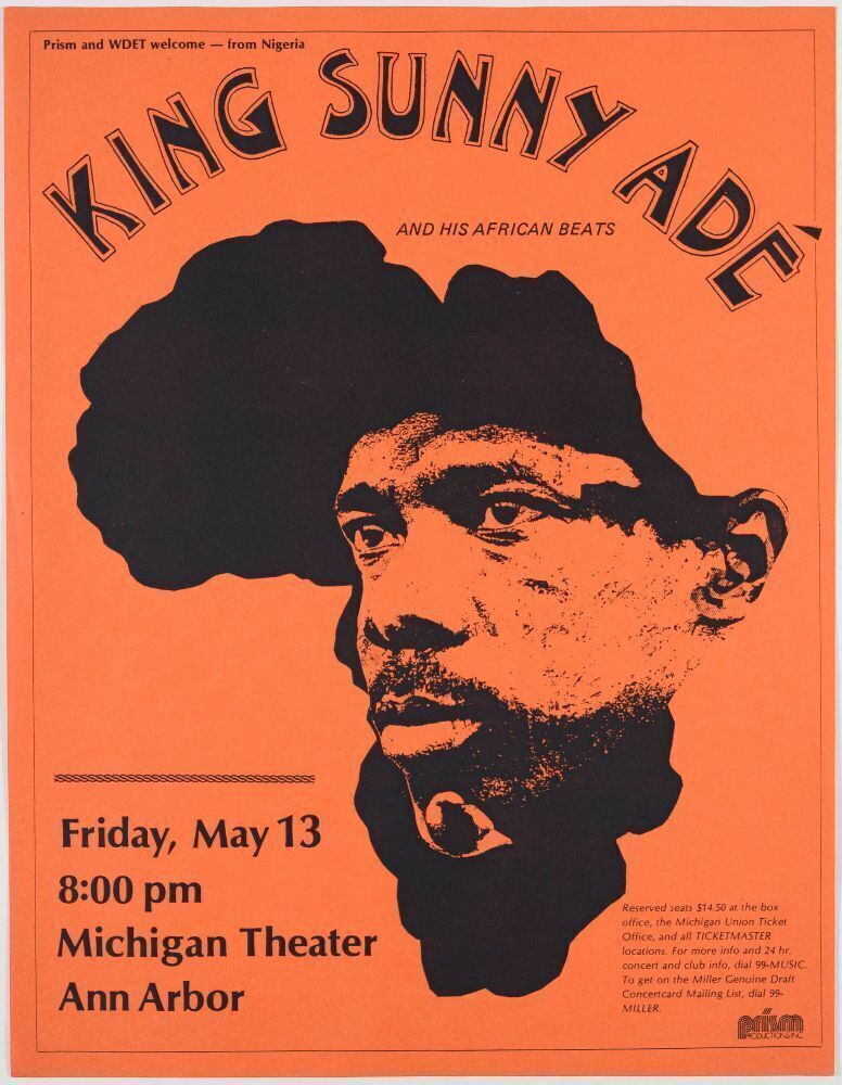 This original flyer advertised a live concert by King Sunny Adé and His African Beats held in Ann Arbor at the Michigan Theater on May 13th, 1994.