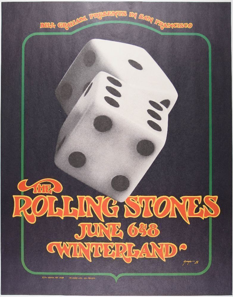 The Stones hit tune Tumbling Dice serves as the inspiration for this killer design from Fillmore artist David Singer. This large-format poster is considered the last poster in the BG numbered series.
