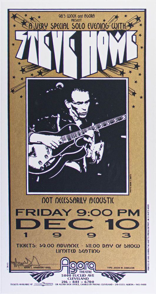 This poster by artist Mark Arminski advertised a solo concert by guitarist Steve Howe of Yes at the Agora Theatre in Cleveland, Ohio, on December 10, 1993, presented by radio station 98.5 WNCX.