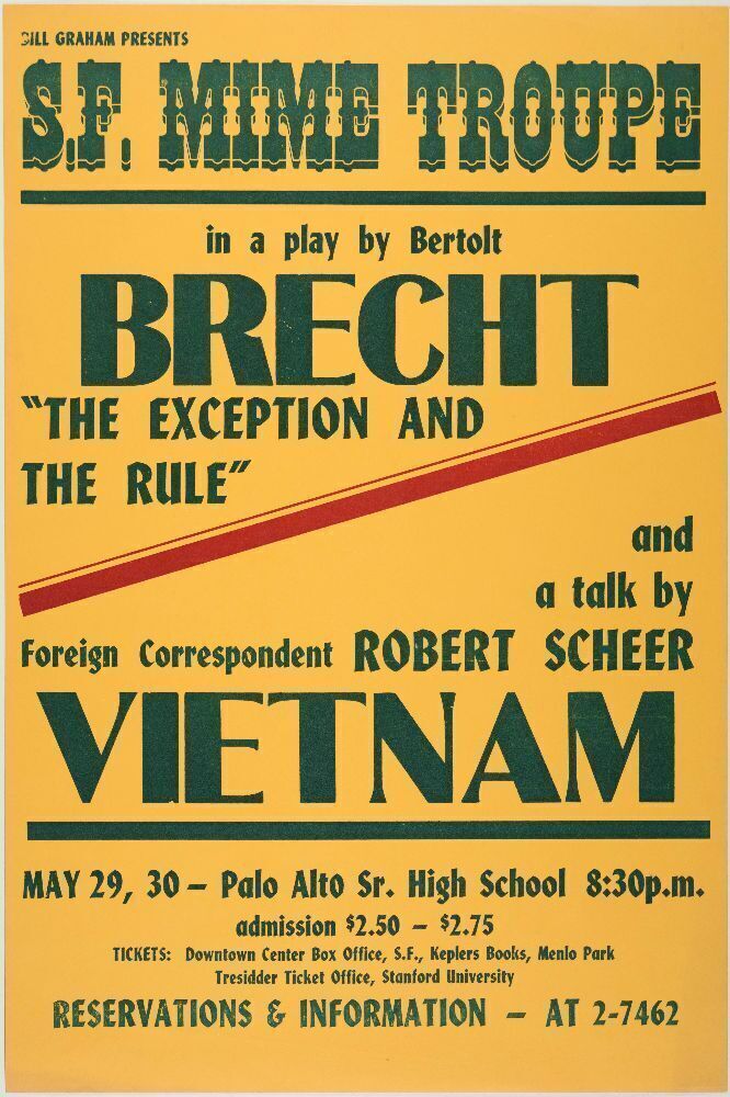 This VERY EARLY Bill Graham 60+ Original Poster was produced for the San Francisco Mime Troupe performing the play “The Exception And The Rule” by Bertolt Brecht. This Palo Alto issue IS THE SECOND poster to feature Bill Graham's name at the top! The first BG listed issue was the week prior in San Francisco. Also included on both nights of this Palo Alto event: a talk by foreign correspondent Robert Scheer about the US War in Vietnam. Scheer reported on the war for the Bay Area literary magazine “Ramparts” between 1964 and 1969. This poster was produced the year before he ran for Congress as one of the first anti-Vietnam War candidates in the country.