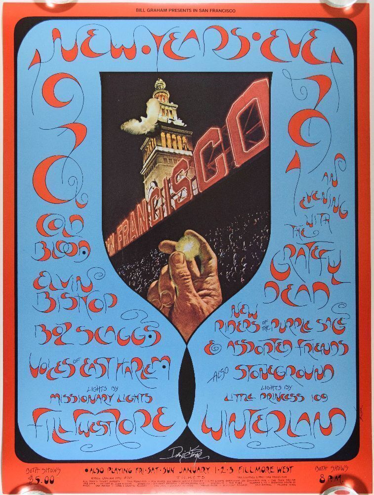 Presenting an example of the first printing of the BG-263 New Year's Eve show poster! Also on the bill were the New Riders of the Purple Sage, Stoneground, Cold Blood, Elvin Bishop, Boz Scaggs, and more.