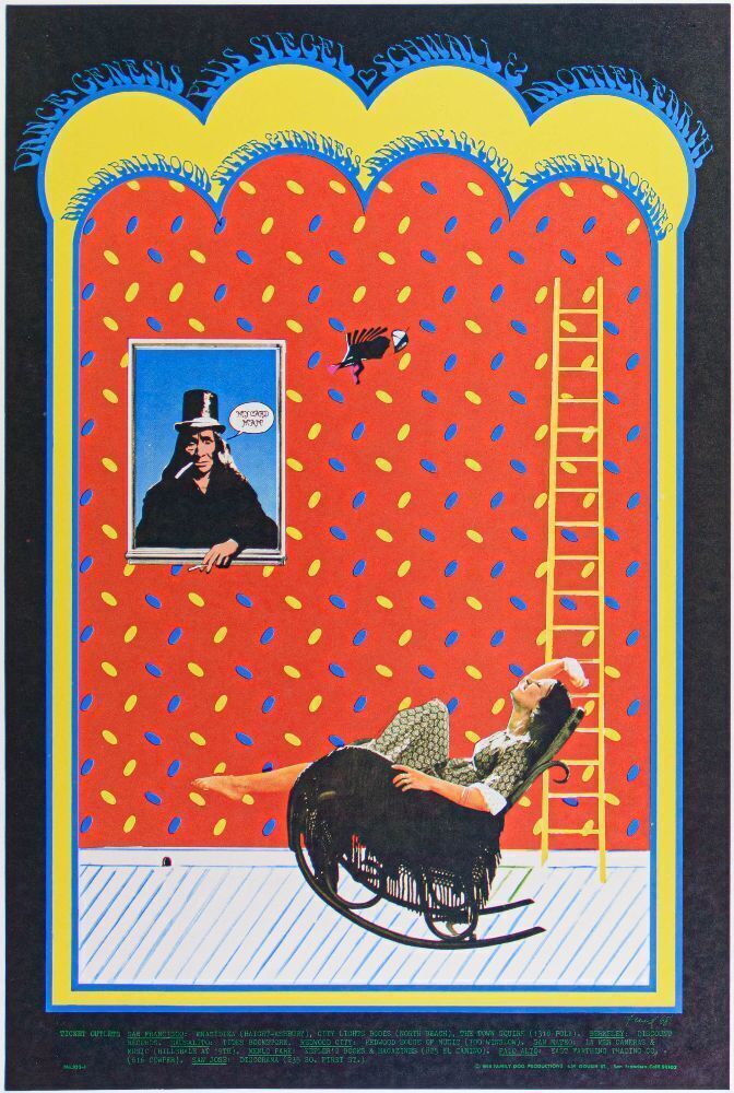 This subtly humorous and delightful design by Bob Fried was for a 1968 run of shows at the Avalon. Bob Fried was one of the most highly regarded poster artists of the era. Fried was a trained commercial artist who taught at the San Francisco Art Institute. Like the work of his friend Victor Moscoso, Fried’s formal training gave his work remarkable precision and restraint, creating designs that explored geometry and color in a strikingly unique style.