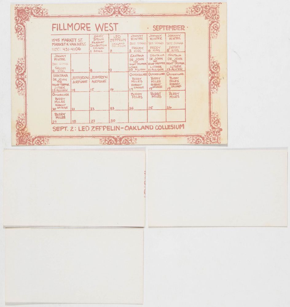 This September 1970 design is another sleeper by Norman Orr, a talented contributor to the later Fillmore West posters. Quicksilver Messenger Service, Buddy Miles and the Robert Savage Group are featured in the lineup. This lot features an original postcard and three original tickets from this run!