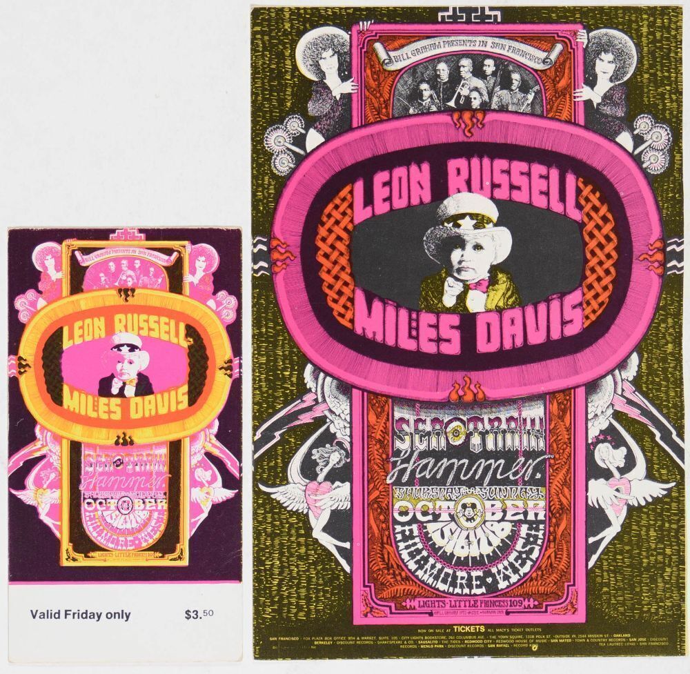 This lot includes an original card/mailer and an original ticket (from the Friday show) from this run. What a lineup! The legendary Leon Russell and the legendary Miles Davis together on an original Fillmore West issue!