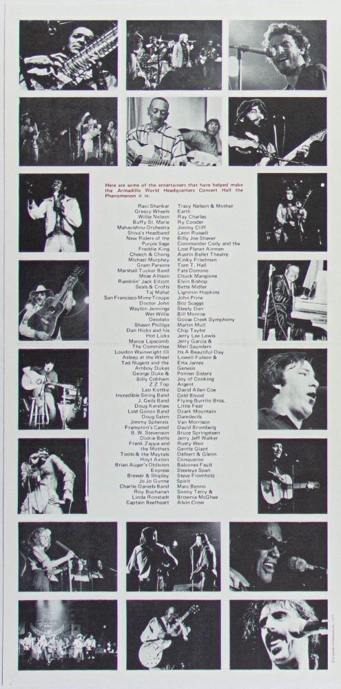 The Armadillo opened in Austin just after the closing of the Vulcan Gas Company. It went on to become the premier venue in that musically rich city from 1970 to 1980. This legendary club offered an incredibly eclectic range of performers in its 10-year tenure. This double-sided flyer was produced and distributed in 1975 celebrating the venue's legacy of performers who had appeared during the first 5 years of the club.