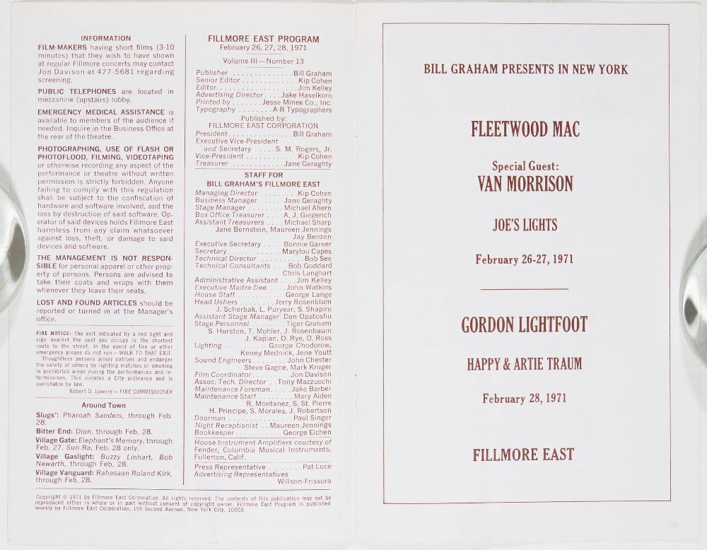 This is an original Bill Graham Program advertising a run of shows at the legendary Fillmore East in New York City, featuring Fleetwood Mac, Van Morrison, and Gordon Lightfoot in February 1971.