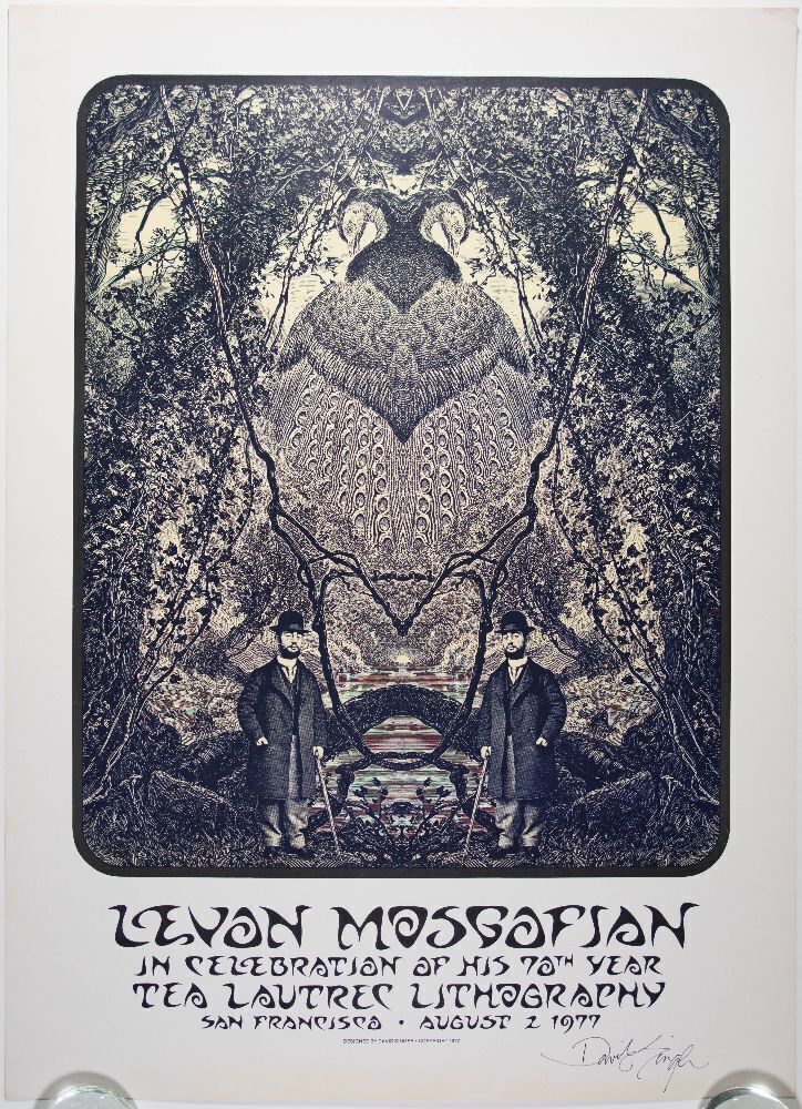 This poster was designed by the legendary concert poster artist David Singer in celebration of Levon Mosgofian's 70th birthday. Levon Mosgofian was a successful printer and the owner of Tea Lautrec Litho.