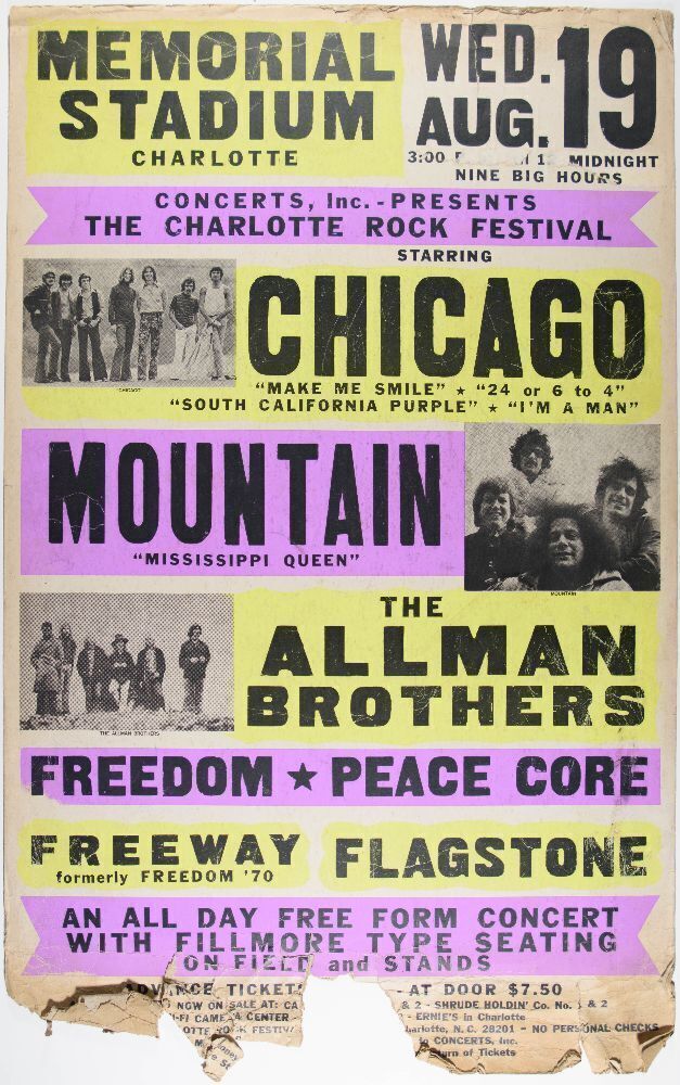 This is the FIRST APPEARANCE of this ultra scarce Globe Cardboard Poster in our auction! Very few posters from the early years of the Allman Brothers Band exist, not to mention the Duane Allman era. The poster advertises The Allman Brothers Band scheduled to appear at the American Legion Memorial Stadium in Charlotte, North Carolina on Wednesday August 19th 1970. Also on the bill were Chicago, Mountain, Freedom, Peace Core and more. The event was advertised as The Charlotte Rock Festival. Records show that the ABB did not perform and the event may have been canceled.
