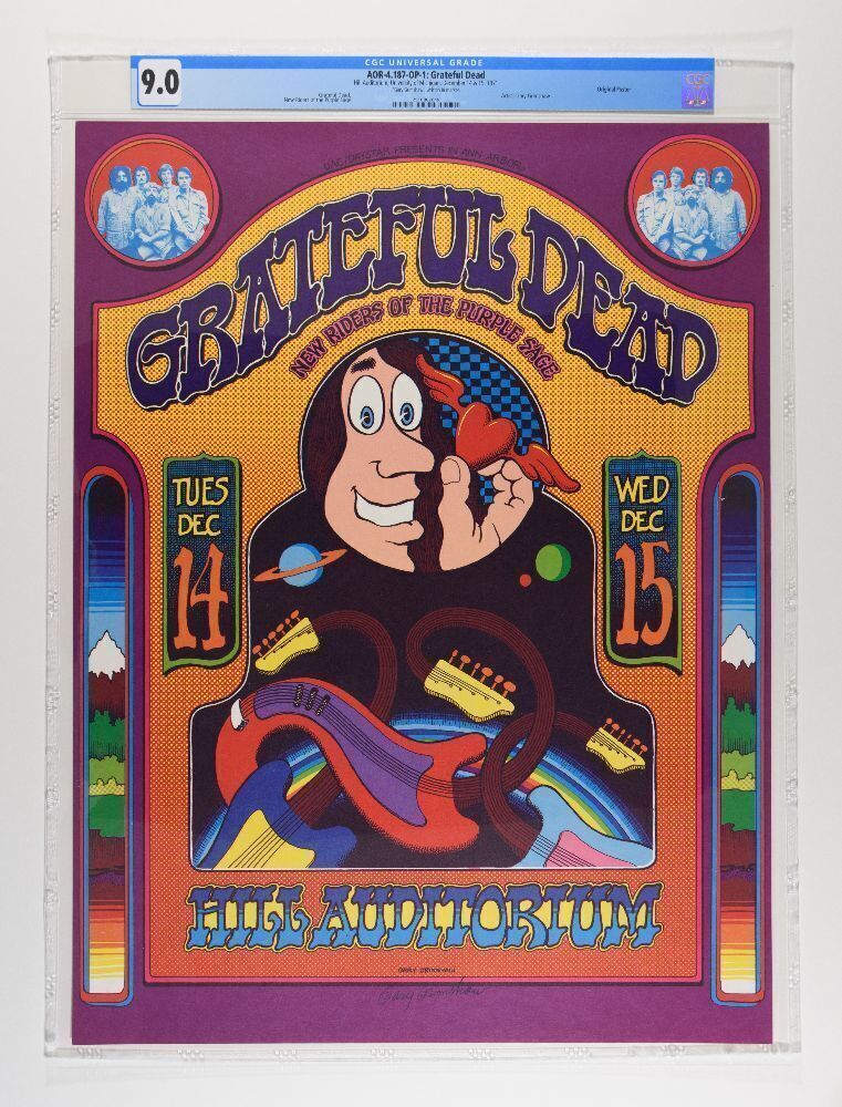 This CGC Graded original, pre-concert printing Grateful Dead poster was created by Detroit artist Gary Grimshaw and it's one of the most popular Dead posters of all time. The cartoon image shows just how diverse Grimshaw’s talent was. He utilized varying styles throughout his poster making career. Also worthy of note, the band's run in Ann Arbor in 1971 is legendary with deadheads.