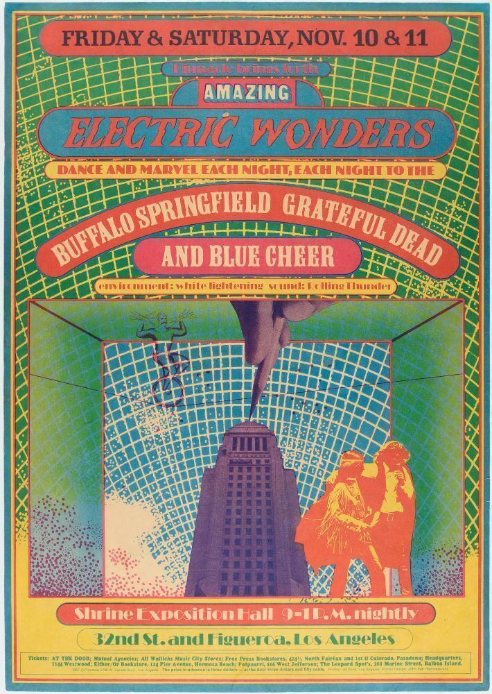 The Amazing Electric Wonders poster is a PAE favorite! The poster dates from November 1967 and was the first in a series of events staged by Pinnacle Productions. The show featured two nights of high-energy performances by the Grateful Dead, Buffalo Springfield, and Blue Cheer.