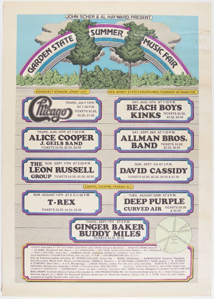 This original summer concert calendar poster promotes shows at New Jersey’s Capitol Theater, Roosevelt Stadium, and the New Jersey State Fairgrounds in the summer of 1972. These summer events included appearances by Chicago, The Beach Boys, The Kinks, Alice Cooper, The Allman Brothers (who ultimately did not play), and many more! The events were presented by promoter John Scher, who was known for his work with the Capitol Theater. During the 1970s and early 1980s, the famous venue in Passaic, New Jersey, became a popular venue for a whole laundry list of major rock artists. Scher worked diligently to bring a steady flow of talent to the 3,200-seat theater.