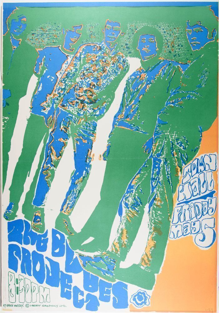 This is a rare poster produced for The Blues Project at Town Hall in New York City on May 5th, 1967. The artwork was created by Bruce Maddox and Liberty Graphics. The Blues Project came together in Greenwich Village in 1965. The classic lineup (with legendary keyboardist Al Kooper) disbanded this same year.