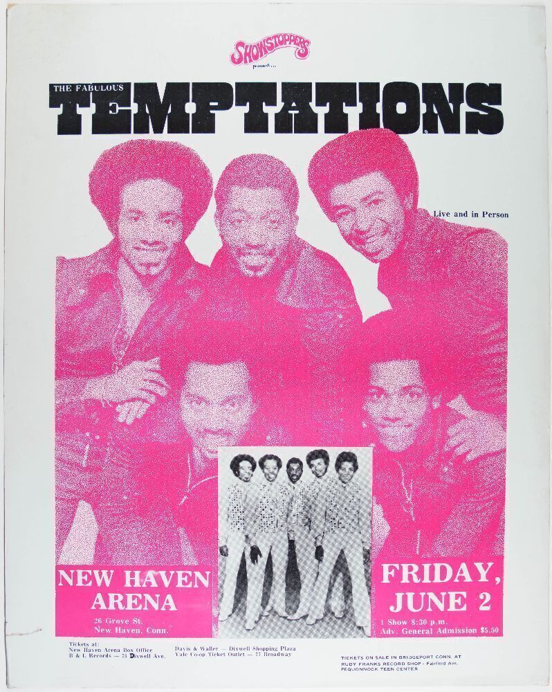 This poster advertised the legendary Temptations appearing at the New Haven Arena on June 2nd, 1972. Under the guidance of Motown's founder, Berry Gordy, and the production team of Holland-Dozier-Holland, The Temptations rose to fame with a string of hits that defined the "Motown Sound" of the 1960s. Songs like "My Girl," "Ain't Too Proud to Beg," "Get Ready," and "Papa Was a Rollin' Stone" became instant classics, earning the group widespread acclaim and commercial success.