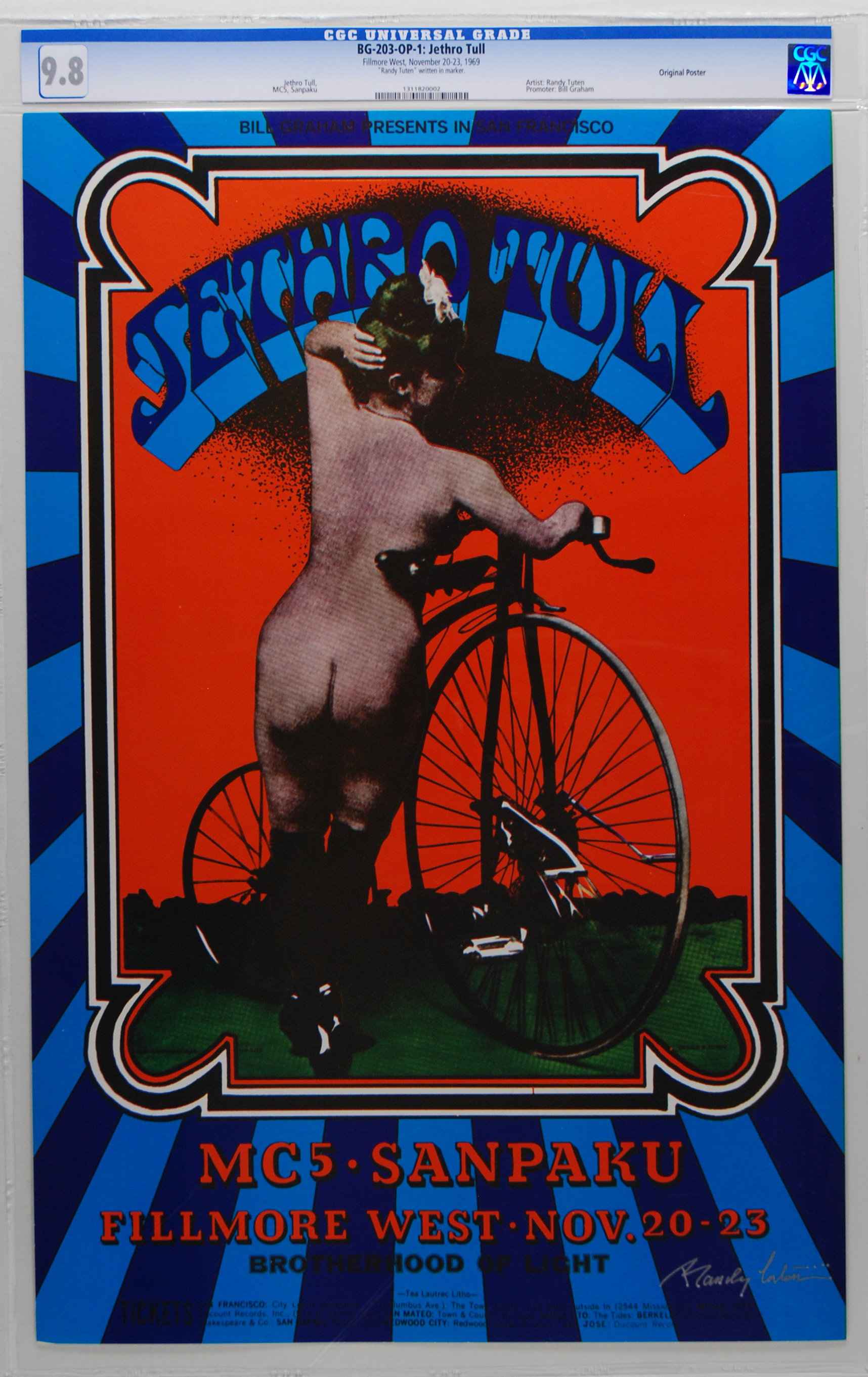 This poster for a 1969 Jethro Tull concert at the Fillmore is one of artist Randy Tuten’s most popular designs. Coupled by the fact that this poster is SIGNED by the artist and in perfect 9.8 museum quality condition it becomes a world class collectible! Read our blog dated 1/20/18 where we discuss the skyrocketing demand for signed material such as this lot.